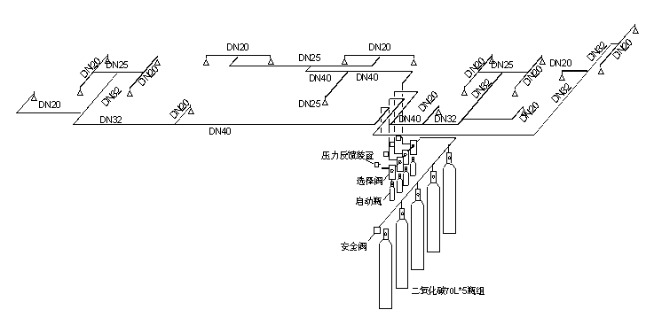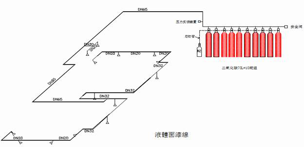 目前,國際上對于自動噴涂設(shè)備的消防保護(hù)是在噴涂設(shè)備上附屬配制一套獨立的CO2局部應(yīng)用系統(tǒng),接在自動噴槍(杯)進(jìn)口,發(fā)生火災(zāi)時,根據(jù)報警信號進(jìn)行自動切換,噴槍(杯)自動噴出CO2氣體,將自動噴涂設(shè)備籠罩,隔絕空氣,以達(dá)到保護(hù)自動噴涂設(shè)備的目的。該套CO2供給系統(tǒng)只與自動噴涂設(shè)備相連,并不與噴漆間總的消防設(shè)施發(fā)生橫向聯(lián)系,獨立性較強(qiáng),而且不影響噴漆室消防系統(tǒng)類型的選擇。