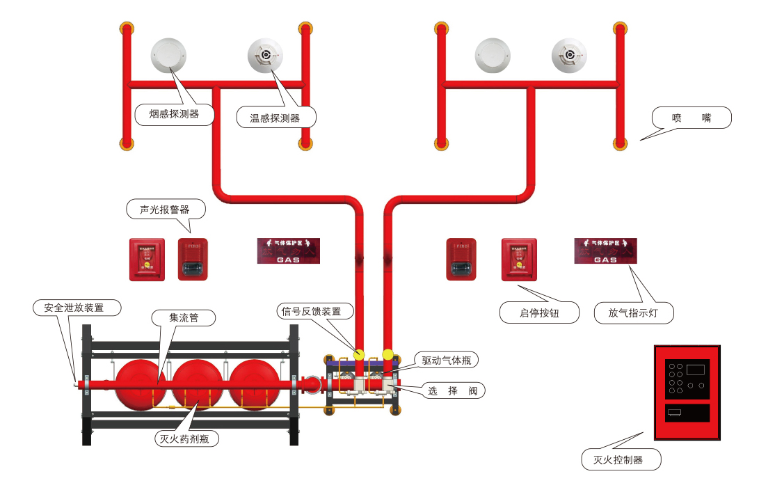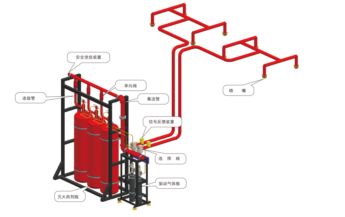 內(nèi)貯壓式七氟丙烷組合分配氣體滅火系統(tǒng)原理圖